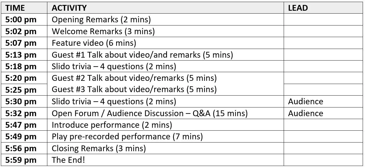 Pre-recorded segments: Using pre-recorded inserts, creates a TV-like feel. Aside from having an engaging host, we included pre-recorded videos (an artist performance and a short 6-minute documentary) and an interactive polling tool, which I will talk more about in my next point. These additions made all the difference.